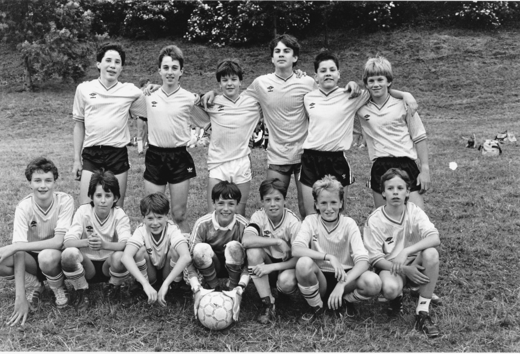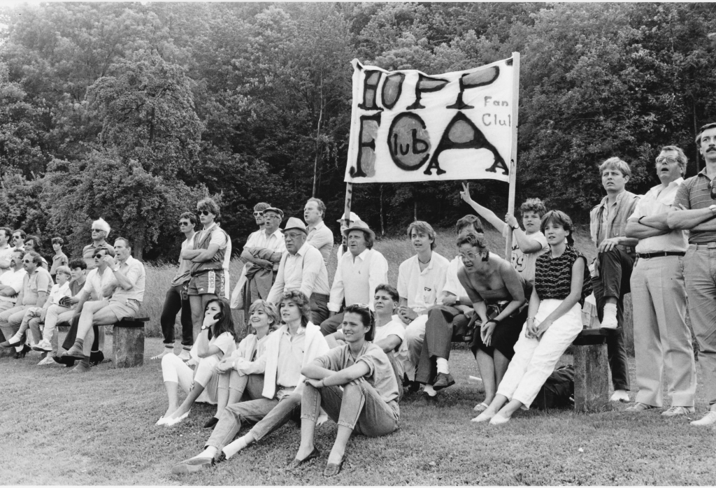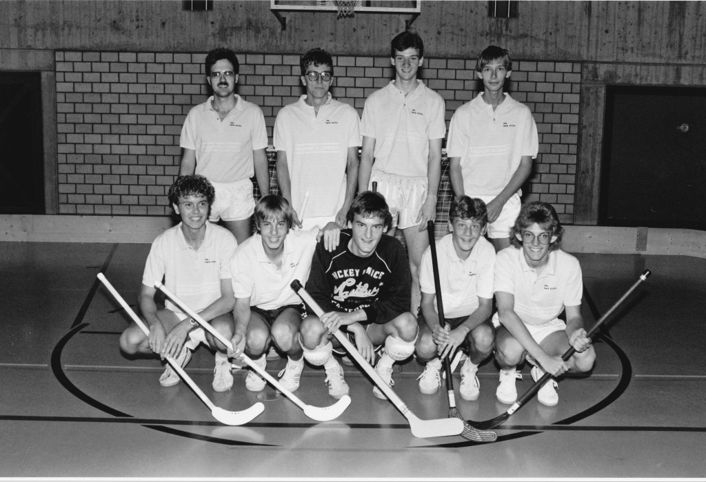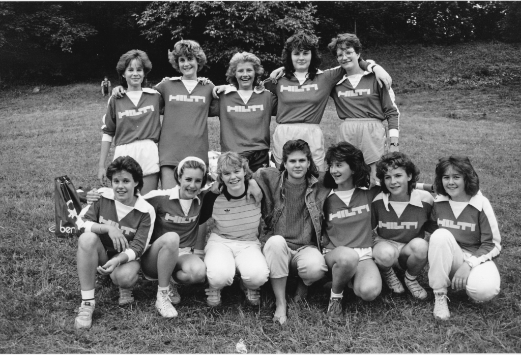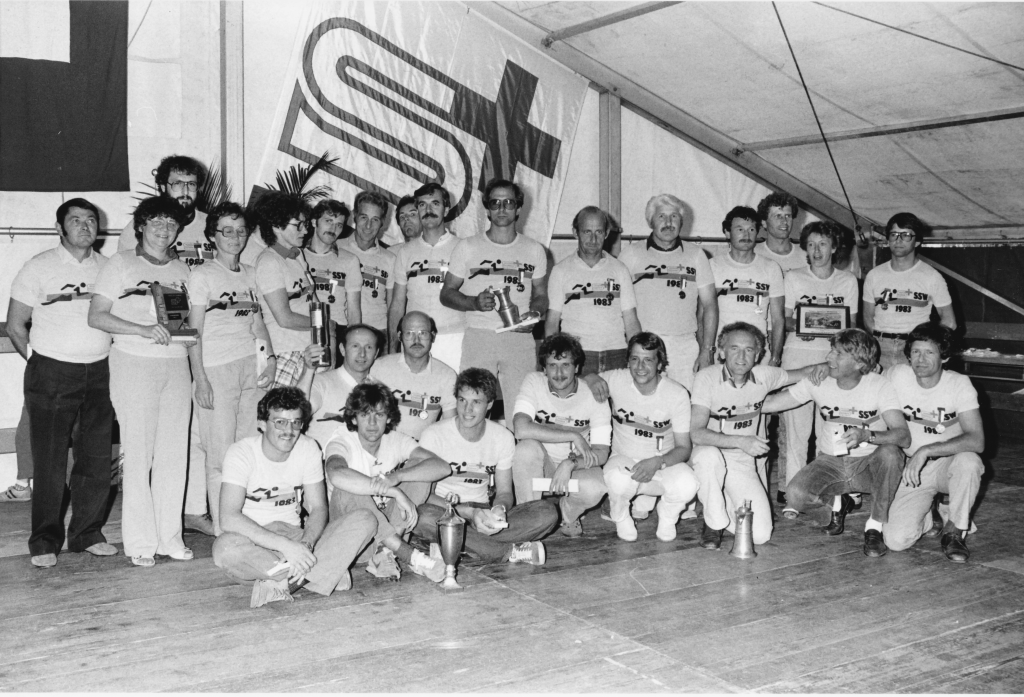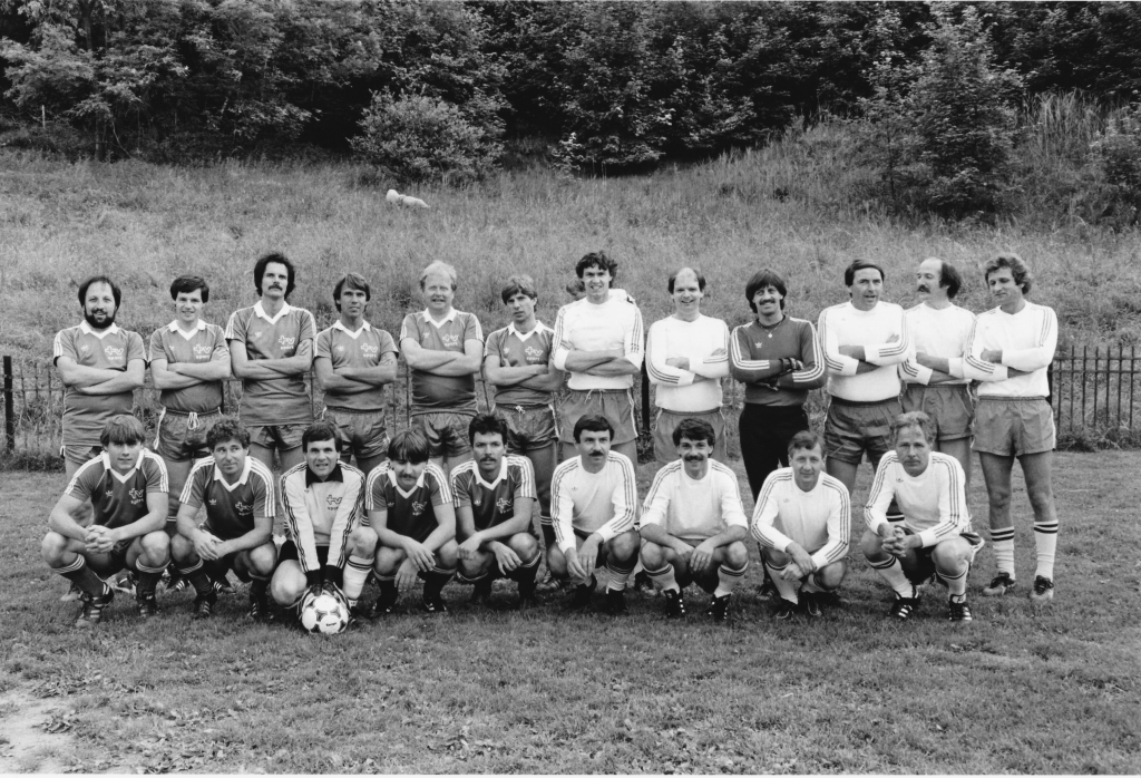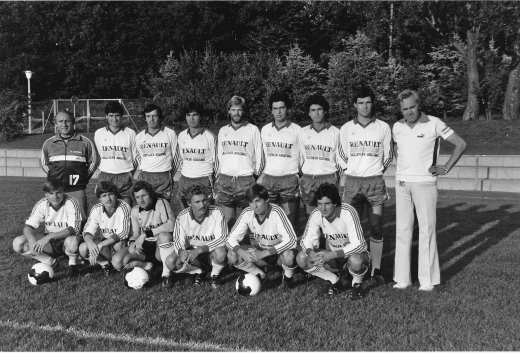 Mannschaft mit Sportreportern SRF und Vorstand FCA am Dorfturnier, 1983