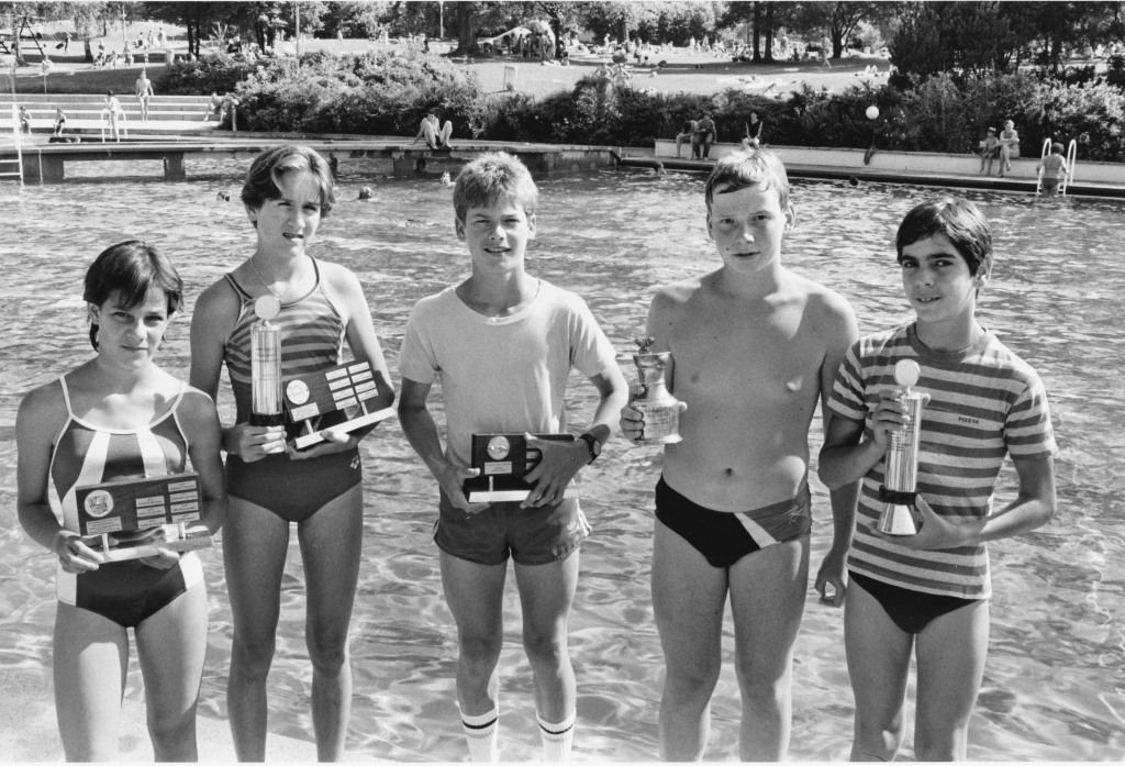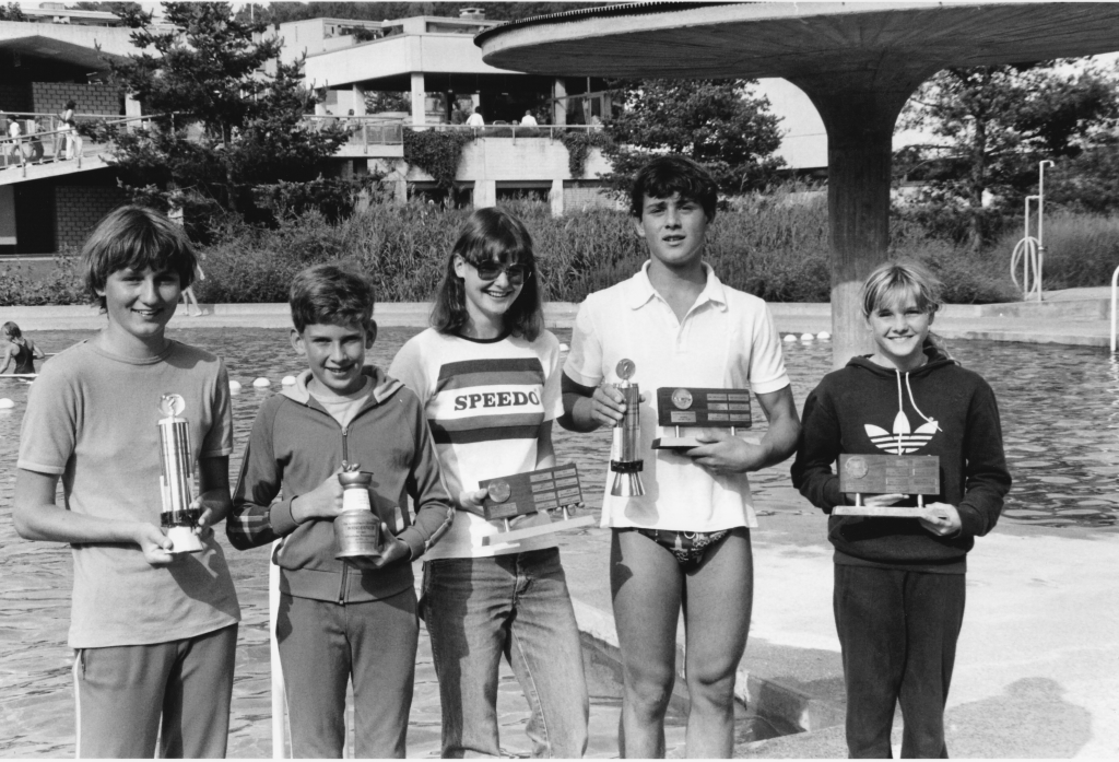 Siegerehrung,,Dä schnällscht Sihlfisch", Schwimmbad im Tal, 1981
