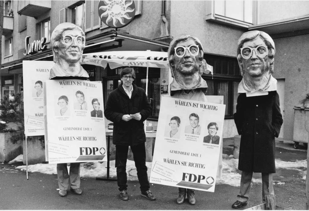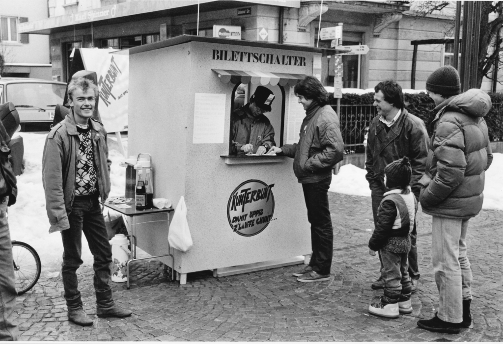 Wahlkampf der Gruppe Kunterbunt, 1986 (1 Sitzgewinn Reto Bossard)