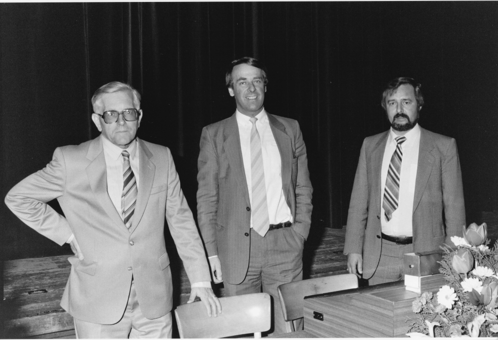Veranstaltung mit Nationalrat Adolf Ogi SVP im Sunne-Saal, mit Stadtrat Henry Hug, 1983