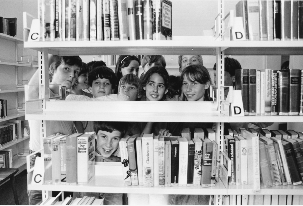 Büchereinräumen in der Ortsbibliothek in der Liegenschaft Albisstrasse 3, 1984