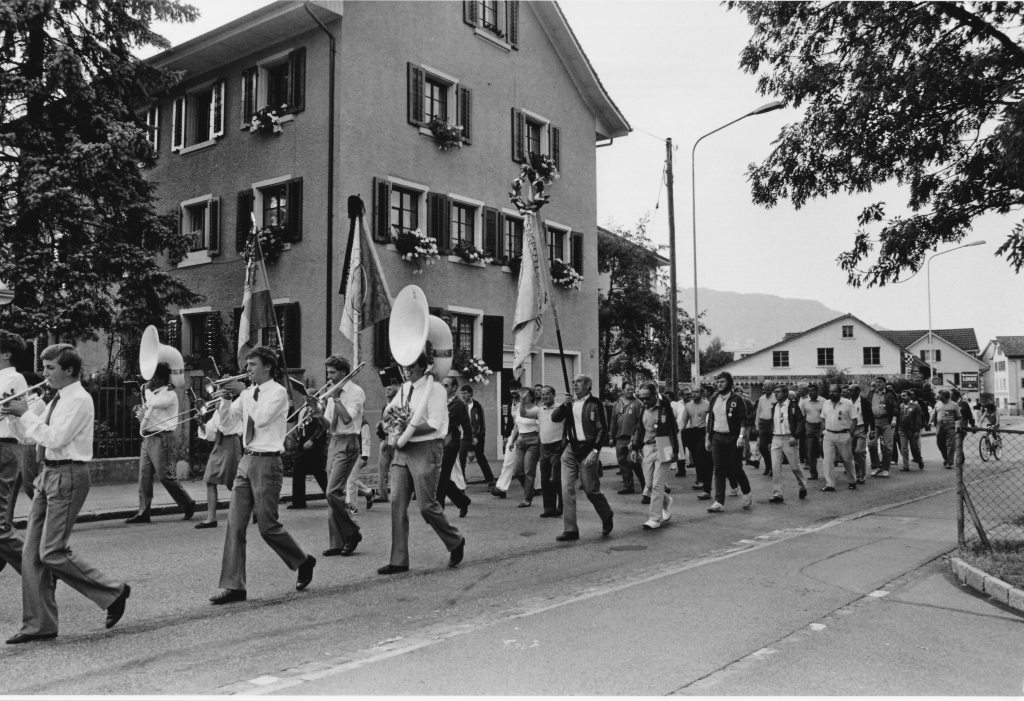Empfang der Schützen nach dem Eidgenössischen Schützfest 1985 in Chur mit dem Jugendspiel Adliswil, 1985