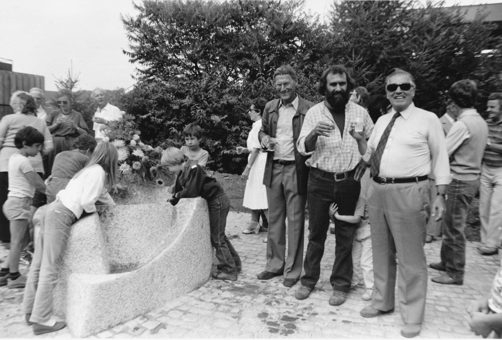 Einweihung Brunnen von Piero Tedoldi in Oberleimbach Erwin Freytag, Präsident Quartierverein Oberleimbach und Stadtpräsident Paul Gysel (1914-1995), 1981